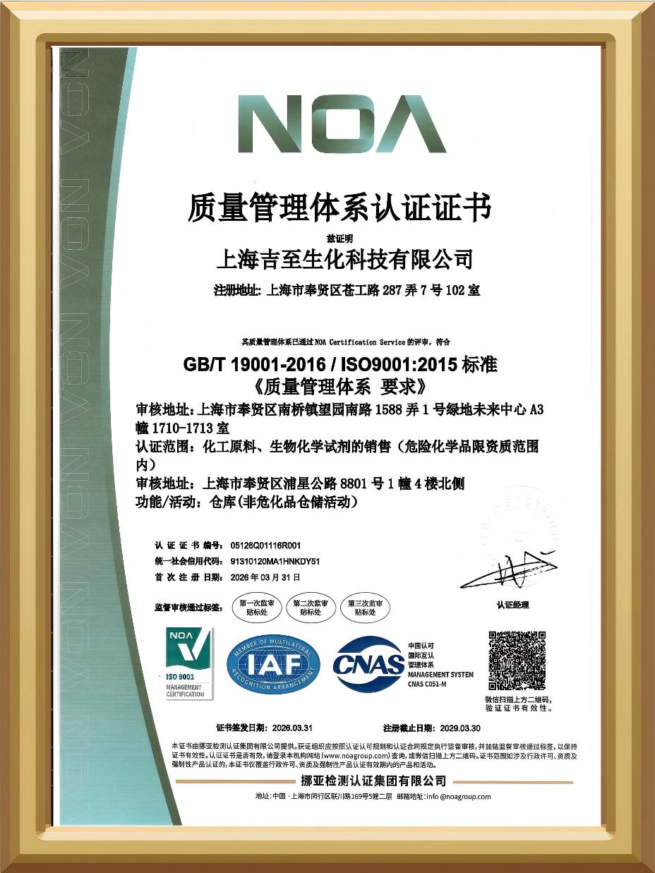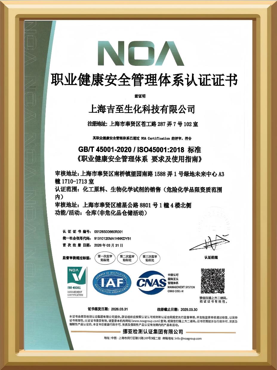 双体系认证的顺利通过,不仅标志着我司经营管理、产品品质、客户服务全面实现规范化、标准化、专业化升级,更彰显了公司在品质管控、安全生产、职业健康防护、长效运营改进等方面的综合实力迈上新台阶。未来,吉至生化将严格遵循两大管理体系标准要求,持续优化内部管理制度与运营流程,全面提升精细化管理水平。以严苛的品控、规范的管理、安全的保障,为各大合作单位持续输出高品质试剂产品与专业化服务,赋能行业发展,助力客户科研实验高效落地。