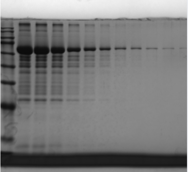过夜染色后的图片,不用脱色,上样量依次为10μg,10μg,5μg、2μg、1μg、500ng、200ng、100ng、50ng、30ng、20ng、10ng、5ng、3ng。